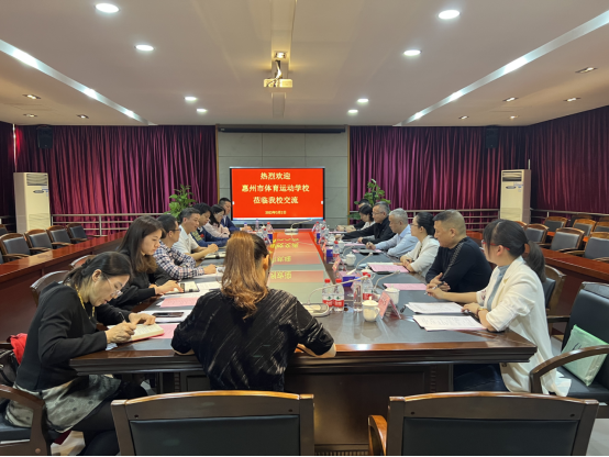 会上我校党委委员王志明对肖剑书记一行的到来表示热烈的欢迎,并介绍了我校基本情况。肖剑书记对我校发展给予高度的评价,并简要介绍了惠州市体育运动学校发展历程及办学成果,表达了与我校深入合作的良好愿景。随后,双方就中高职贯通培养三二分段合作方式、人才培养方案制定等相关事项展开深入研讨。双方均表示,希望能进一步加强沟通交流,发挥各自优势,加深合作,共同推进三二分段制中高职贯通培养衔接工作深入有序开展。