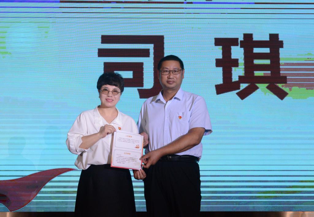 校党委书记司琪为7月入党的党员代表赠送党员政治生日卡
